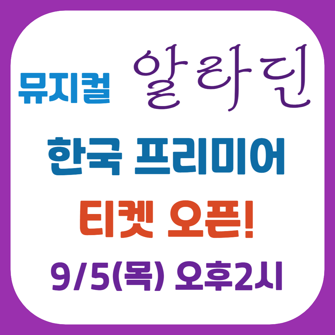 뮤지컬 알라딘이 드디어 한국에서 초연합니다. 토니상, 드라마데스크상에 빛나는 전 세계적인 뮤지컬 알라딘의 오리지널 스케일을 경험할 수 있는 기회입니다. 화려한 무대와 의상, 그리고 마법 같은 이 뮤지컬의 티켓이 9월 5일 오후 2시에 오픈합니다. 예매 정보를 확인하시기 바랍니다.
