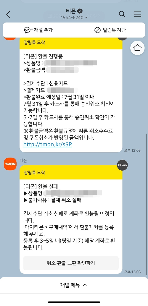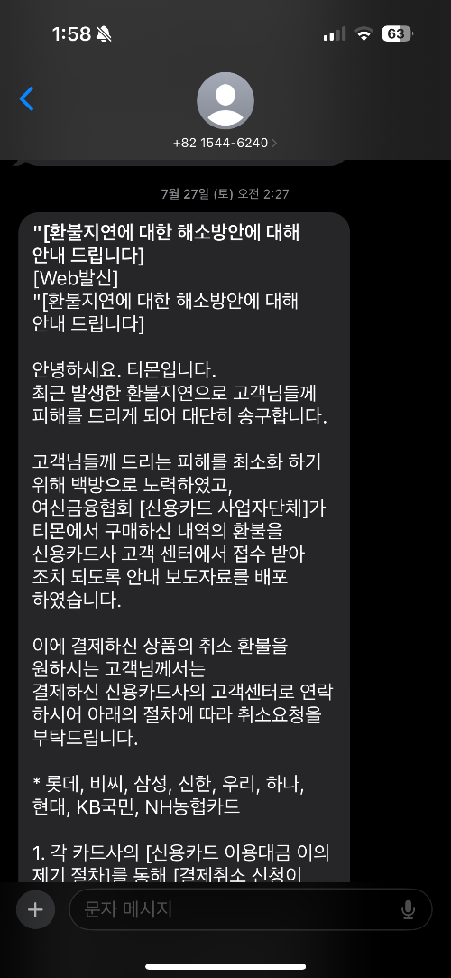 - 티몬/위메프에서 발송된 환불지연 관련 메시지 캡처