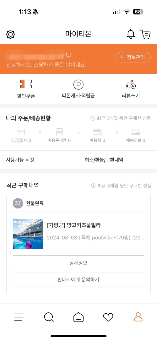 - 티몬: 티몬 사이트 또는 모바일 애플리케이션 접속 - 로그인 - 마이티몬 - 캡처