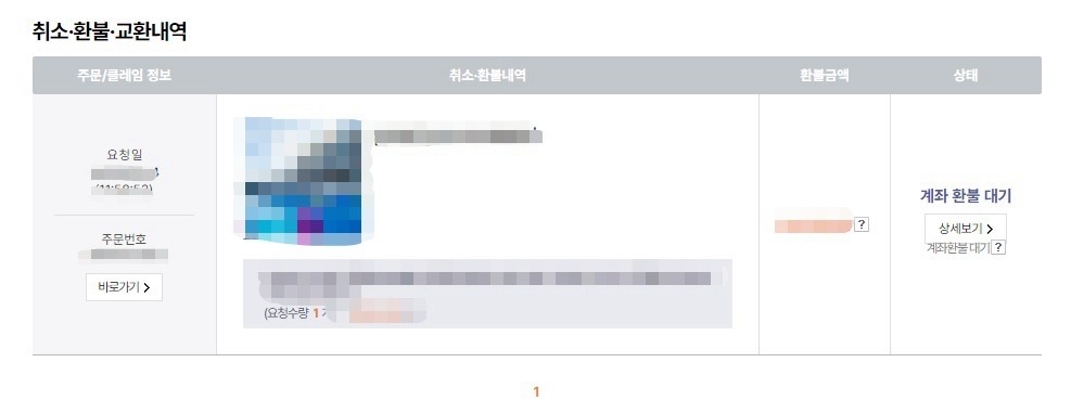 - 환불/취소 내역에서 요청일, 주문번호, 결제 금액, 상품명, 환불 대기 상태 표시가 모두 나오게 캡처