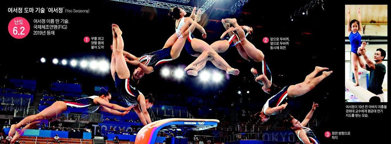 2021년 열린 2020 도쿄 올림픽에 출전하여 예선 4위로 결선 진출에 성공하며 대한민국 여자 기계체조 역사상 최초로 올림픽 종목별 결선에 진출하게 됩니다. 결승 1차 시기에서는 자신의 이름을 딴 기술인 여서정을 성공하면서 난이도 6.2 기술로 15.333점을 받았고, 2차 시기에서는 5.4 난이도의 기술에서는 착지 실수로 14.133점을 기록하면서 1, 2차 시기 평균 총 14.733점으로 3위를 기록하여 대한민국 여자 기계체조 역사상 첫 올림픽 메달인 동메달을 획득했습니다. 또한 대한민국 올림픽 역사상 최초로 부녀 메달리스트가 되었습니다. 이때 여홍철 선수는 KBS 해설위원이었는데, 타 방송사 시청률은 무려 10% 이상 제치며 부녀 메달리스트를 향한 국민적 관심과 사랑을 느낄 수 있었습니다.
